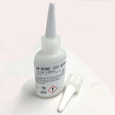 M-Bond 200 is a cyanoacrylate that has been pre-tested and certified for use in bonding strain gages. It is an excellent general-purpose adhesive for laboratory and short-term field applications. The procedure for making a strain gage installation with M-Bond 200 is illustrated and described in detail in Instruction Bulletin B-127 included in each kit of adhesive.