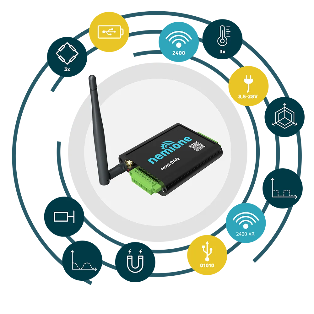 nemi DAQ is i4M’s small all-rounder in terms of Data AcQuisition. It is a wireless telemetry module with a wide range of connection options to measure and monitor strains, loads, forces, displacements (e.g. cracks) or temperatures. In addition to that, various digital and analog sensors can be connected. With its integrated IMU, it also measures accelerations, rotation rates, rotation angles and magnetic fields. Due to the long battery life and our highly efficient radio technology nemi Link 2400, nemi DAQ is ideally suited for use in rotating or moving applications such as torsion / torque measurements in drive trains or load measurements on rotating or moving components. For permanent installations, it can be operated with a wide-range voltage input.